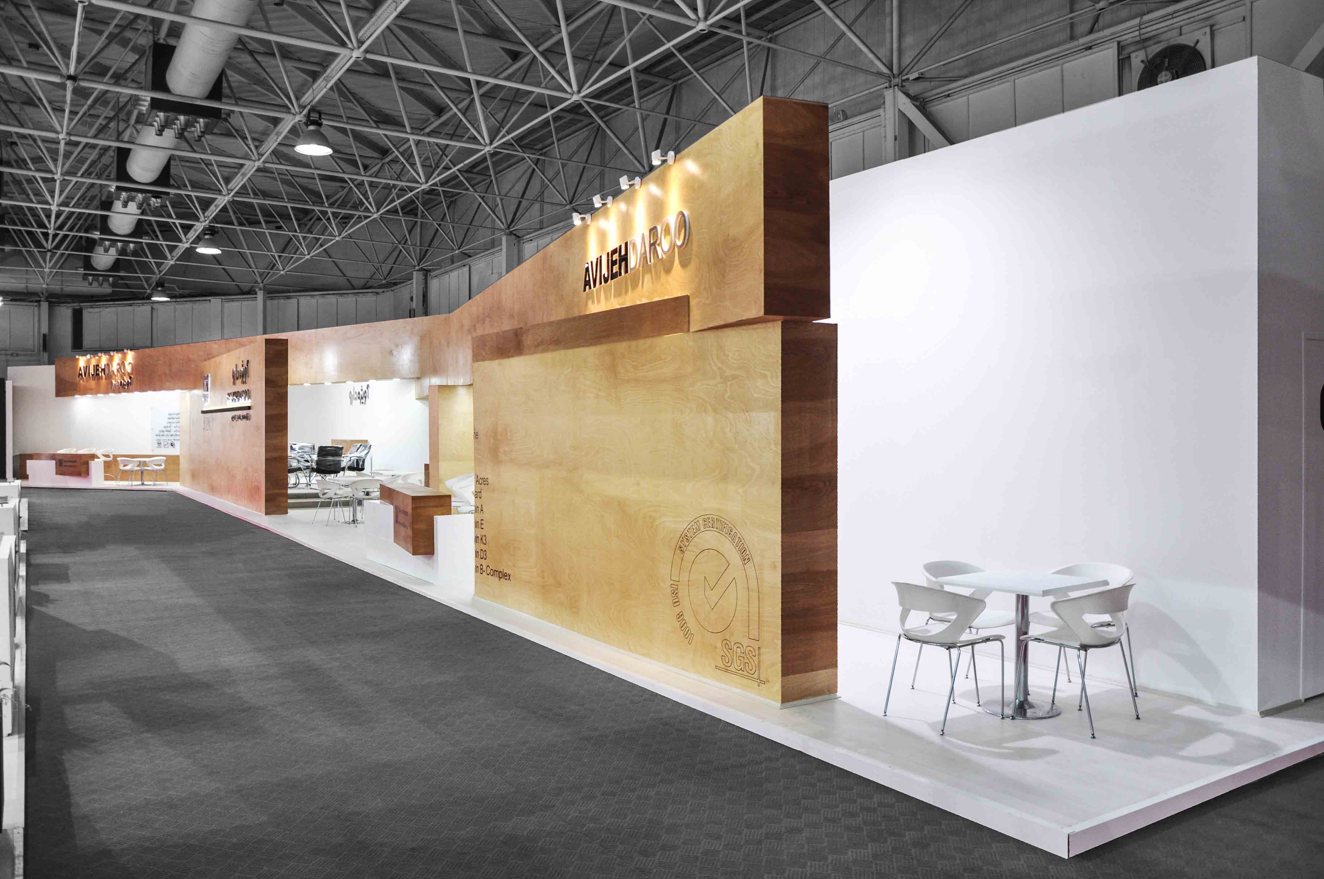 Since the Avijeh Daroo booth 2017 could be seen from two perpendicular corridors, it was decided to place a big wall on the longer side like a big billboard to support the weight of the other wall, which was visible from the corridors.