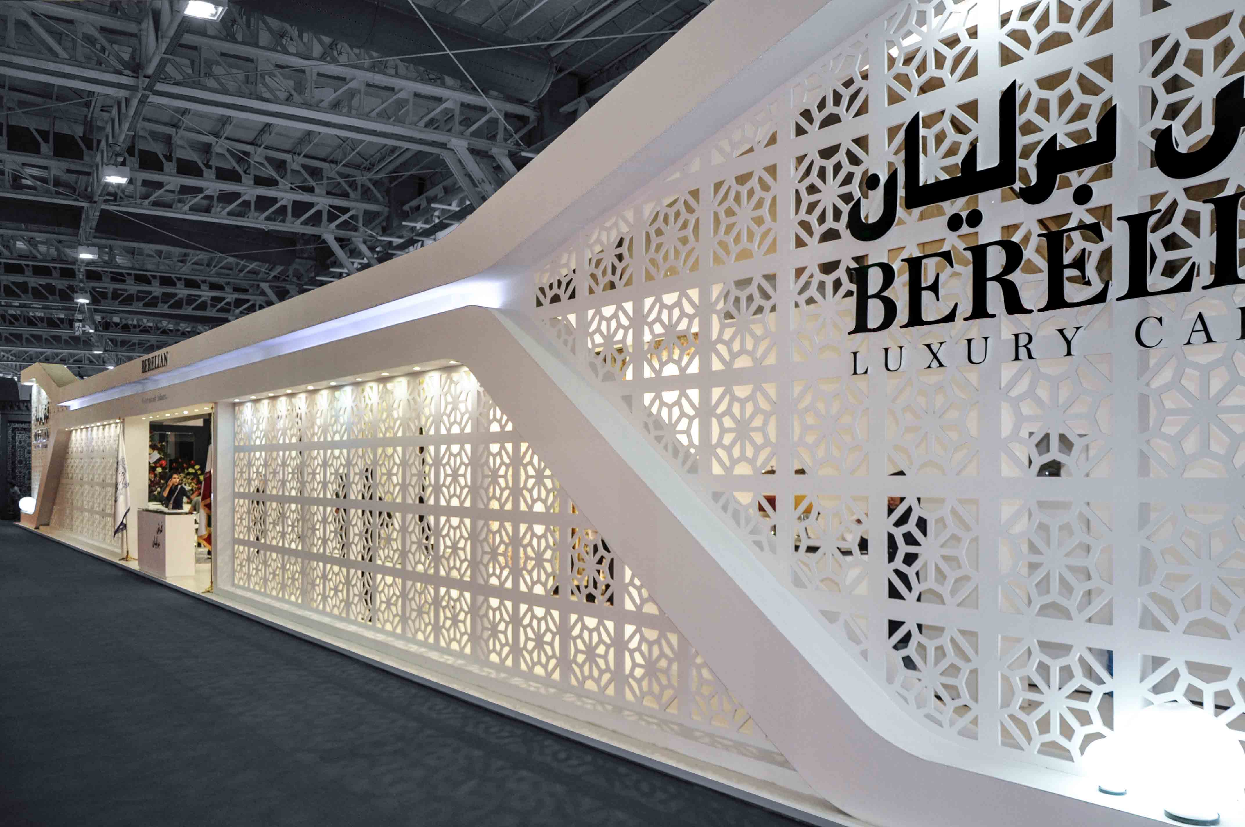 At the Berelian Carpet Booth at The 8th International Floor Coverings, Moquette, Machine Made Carpet and Related Industries Exhibition, an attempt was made to use a semi-transparent shell, consisting of repeating an authentic pattern from architecture and close to carpet motifs.