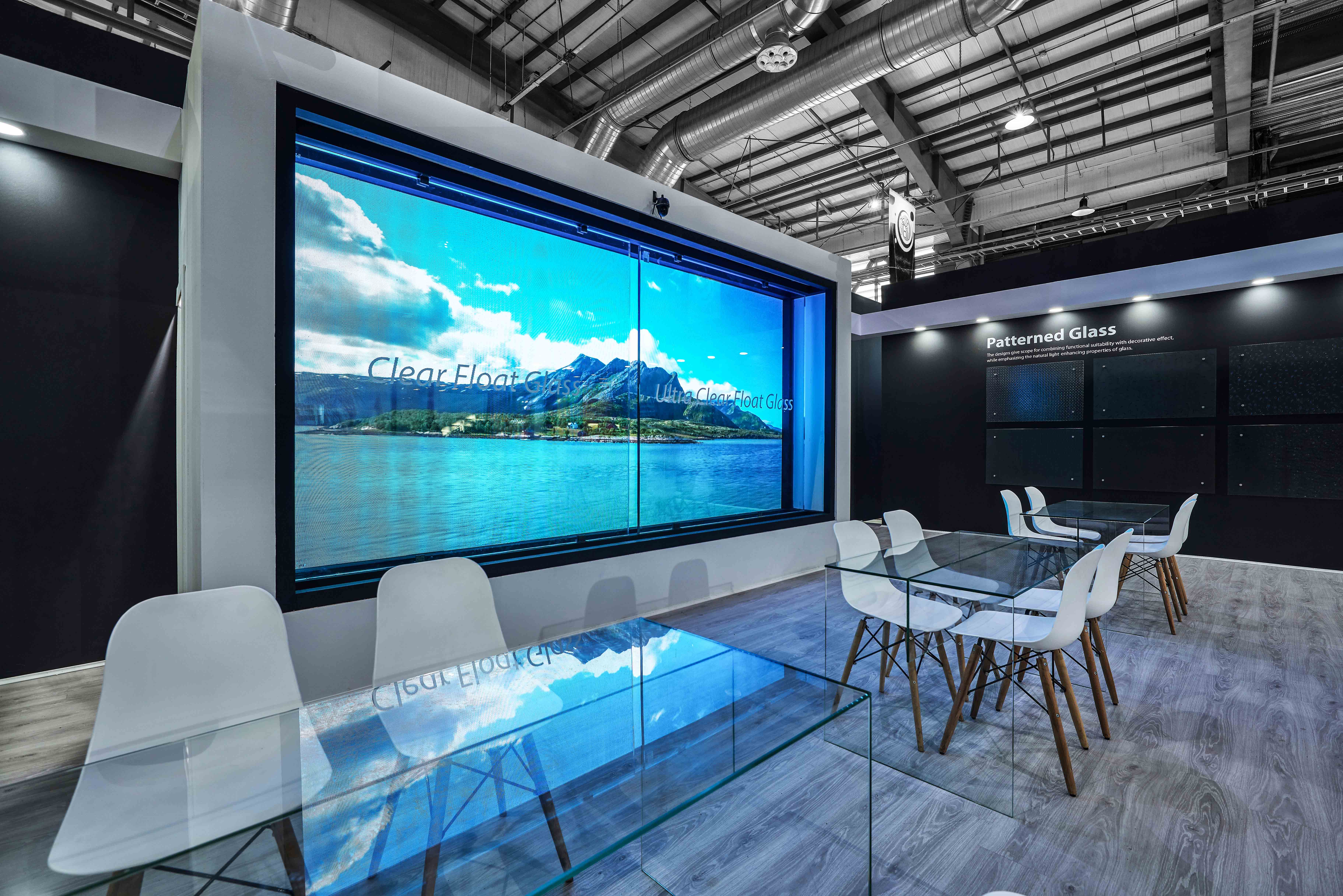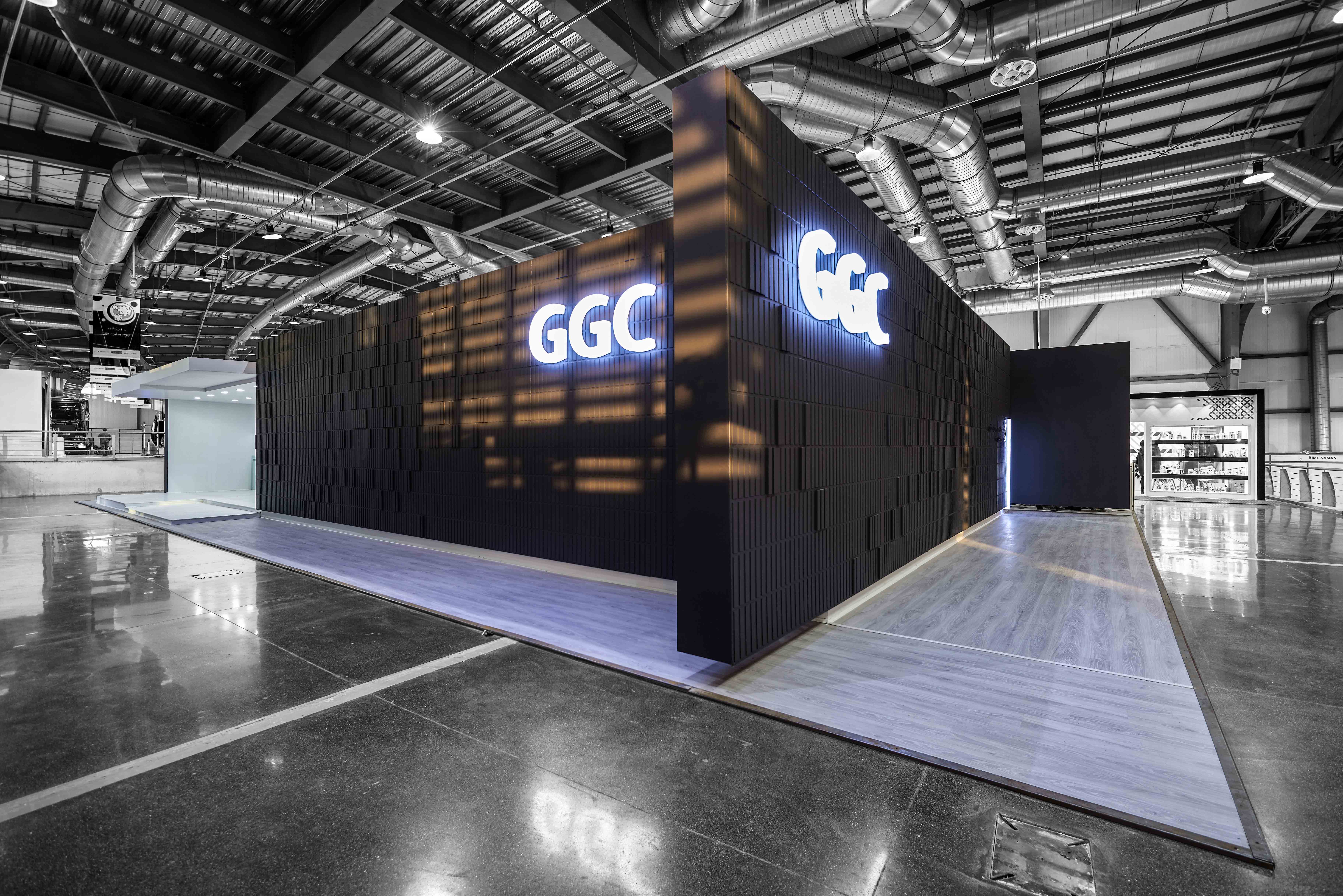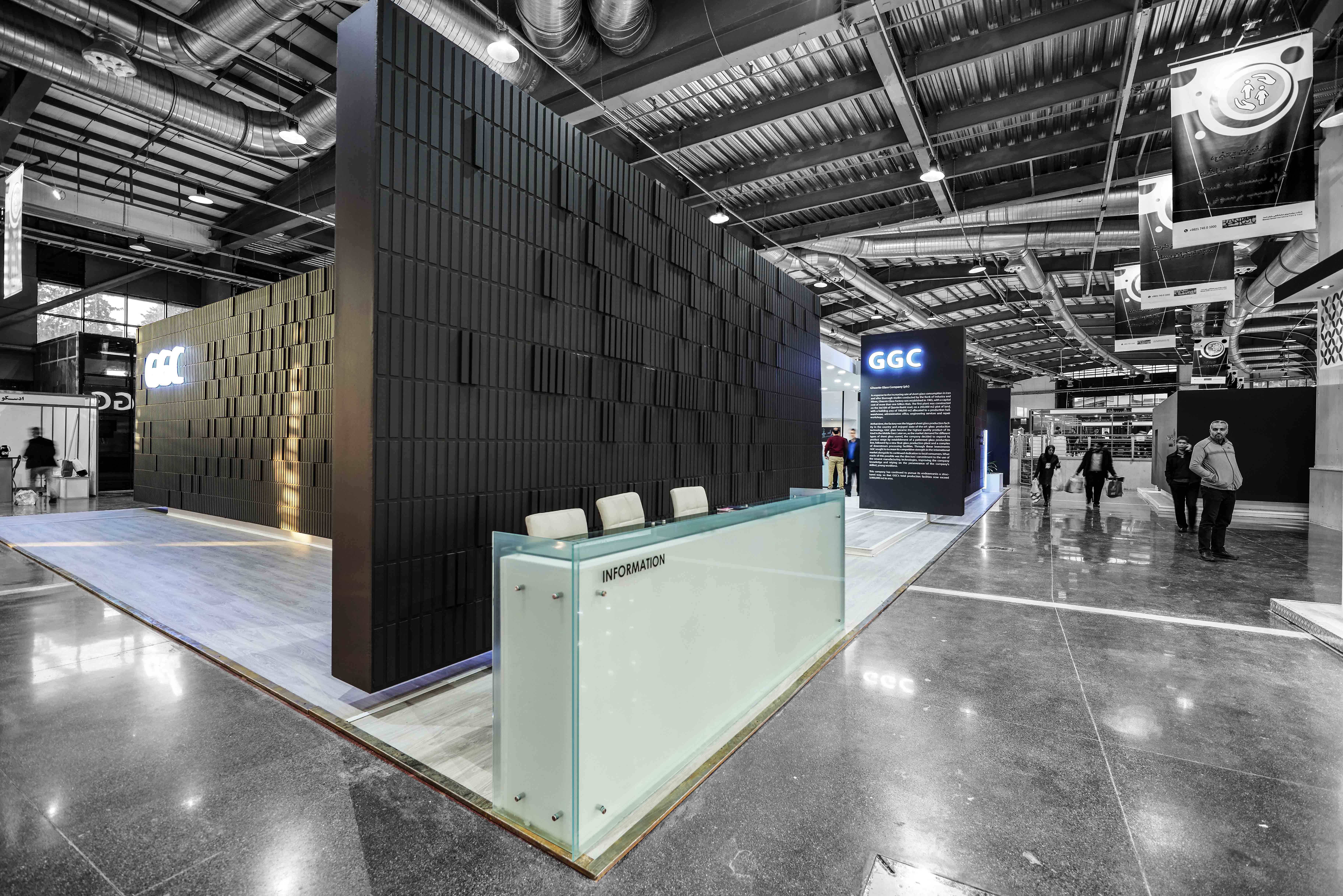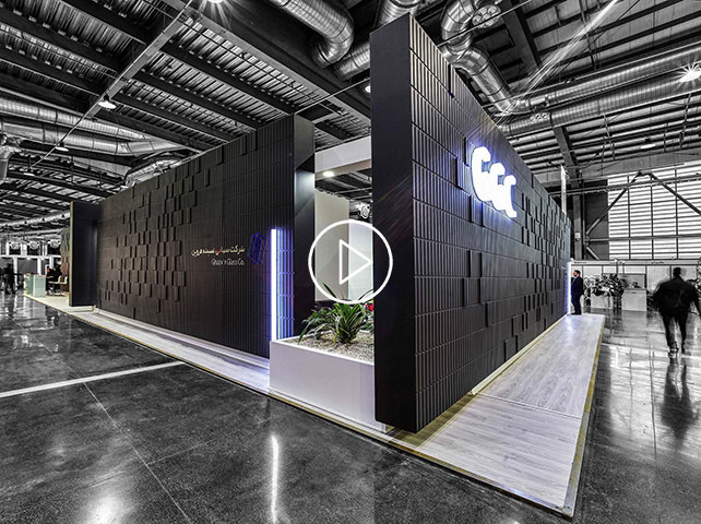 In the design of the Ghazvin Glass Co Booth, the walls are placed next to each other like dark-colored shells, so that they show a horizontal movement to the viewers, and there are entrances on the four sides of the booth, both as entrance and a short display from inside the black box.